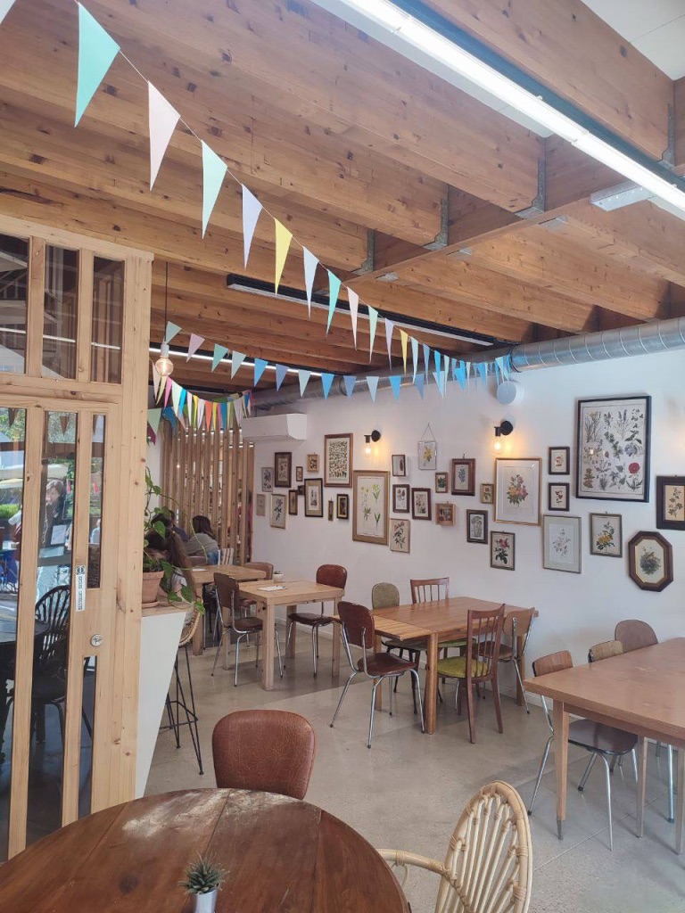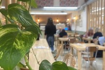 La café-cantine est un lieu de vie en journée, qui propose boissons, pâtisserie et restauration 100% végétarienne et faite maison.